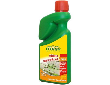 Milieuvriendelijke onkruidbestrijding met Ultima Quick spray van Ecostyle Deze milieuvriendelijke onkruidverdelger van Ecostyle is makkelijk in gebruik en heeft al zichtbaar resultaat binnen de uur! Ultima Quick spray maakt gebruik van het natuurlijke pelargonzuur die via de celwanden van de plant binnendringt en deze van binnenuit gaat. Bodemleven kan niet tegen deze zure oplossing, en in veel afwasmiddelen zitten fosfaten (hierdoor breekt de oppervlaktespanning van water) daardoor vloeit de oplossing mooi uit.